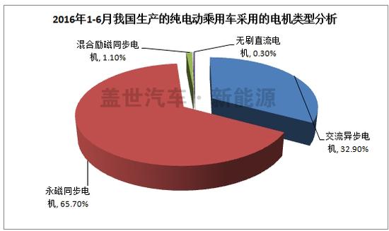 2016年上半年我國(guó)共生產(chǎn)約70000輛純電動(dòng)乘用車,其中永磁同步電機(jī)的裝機(jī)量約為46000輛,所占比例約為65.7%;交流異步電機(jī)的裝機(jī)量約23000輛,占比約32.9%;混合勵(lì)磁同步電機(jī)裝機(jī)量約760輛,占比約1.1%;無(wú)刷直流電機(jī)裝機(jī)量較少,占比約0.3%。如圖1所示。